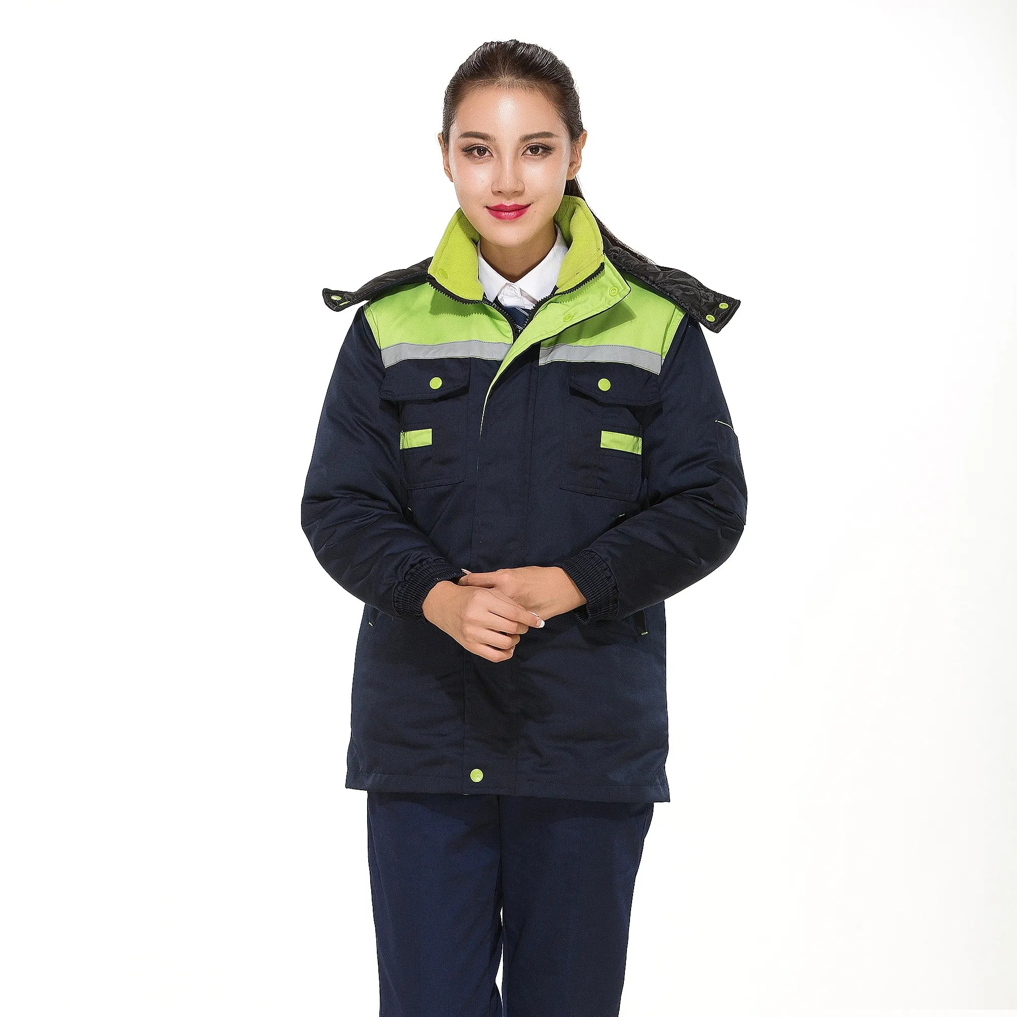 Winter workwear in navy blue and green, supporting custom style design, with the option to print text and logos